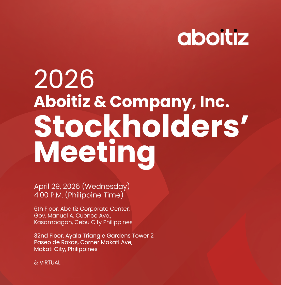 Notice is hereby given that the Annual Stockholders’ Meeting of ABOITIZ & COMPANY, INC.will be held on April 29, 2026 at 04:00 PM (Philippine Time) ("2026 ASM"). The meeting will be streamed live from the Company’s principal office at Aboitiz Corporate Center, Gov. Manuel A. Cuenco Ave., Kasambagan, Cebu City. Stockholders may attend the meeting online, or in person at the 6th Floor Boardroom at Aboitiz Corporate Center, or at the Makati venue at 32nd Floor, Ayala Triangle Gardens Tower 2, Paseo cor. Makati Ave., Makati City.